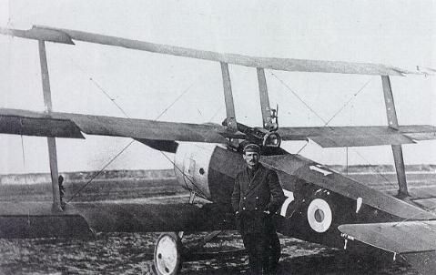 Le Sopwith 130 ch triplan N° 17 de l'escadrille terrestre de Chasse du CAM de Dunkerque en 1917 et son pilote, le QM Ferdinand Vacher. (Vacher/ ARDHAN)